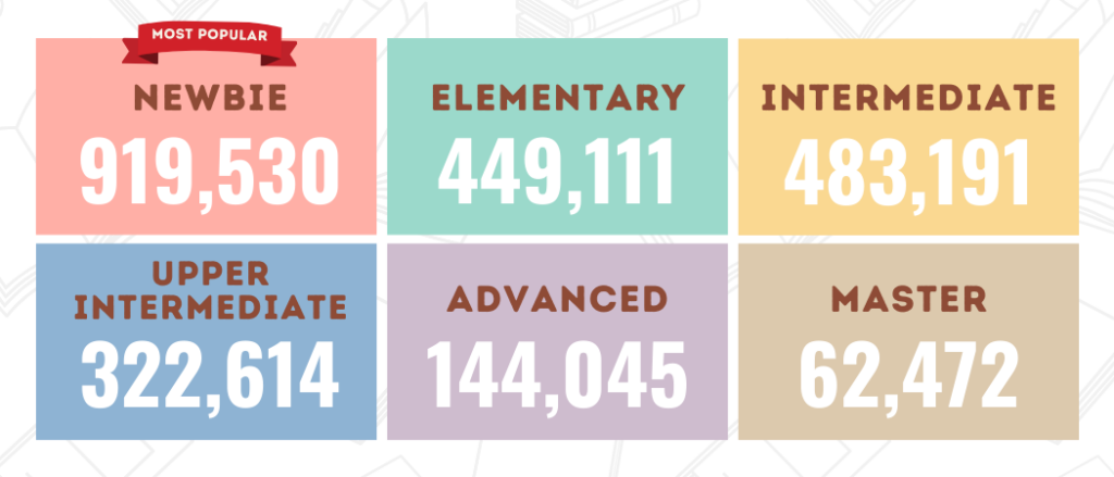 Here’s how many readings (articles, chapters from stories, and lessons from courses) were read this year across our six difficulty levels. In 2025, over 2.3 million Du Chinese readings were read by our readers!
